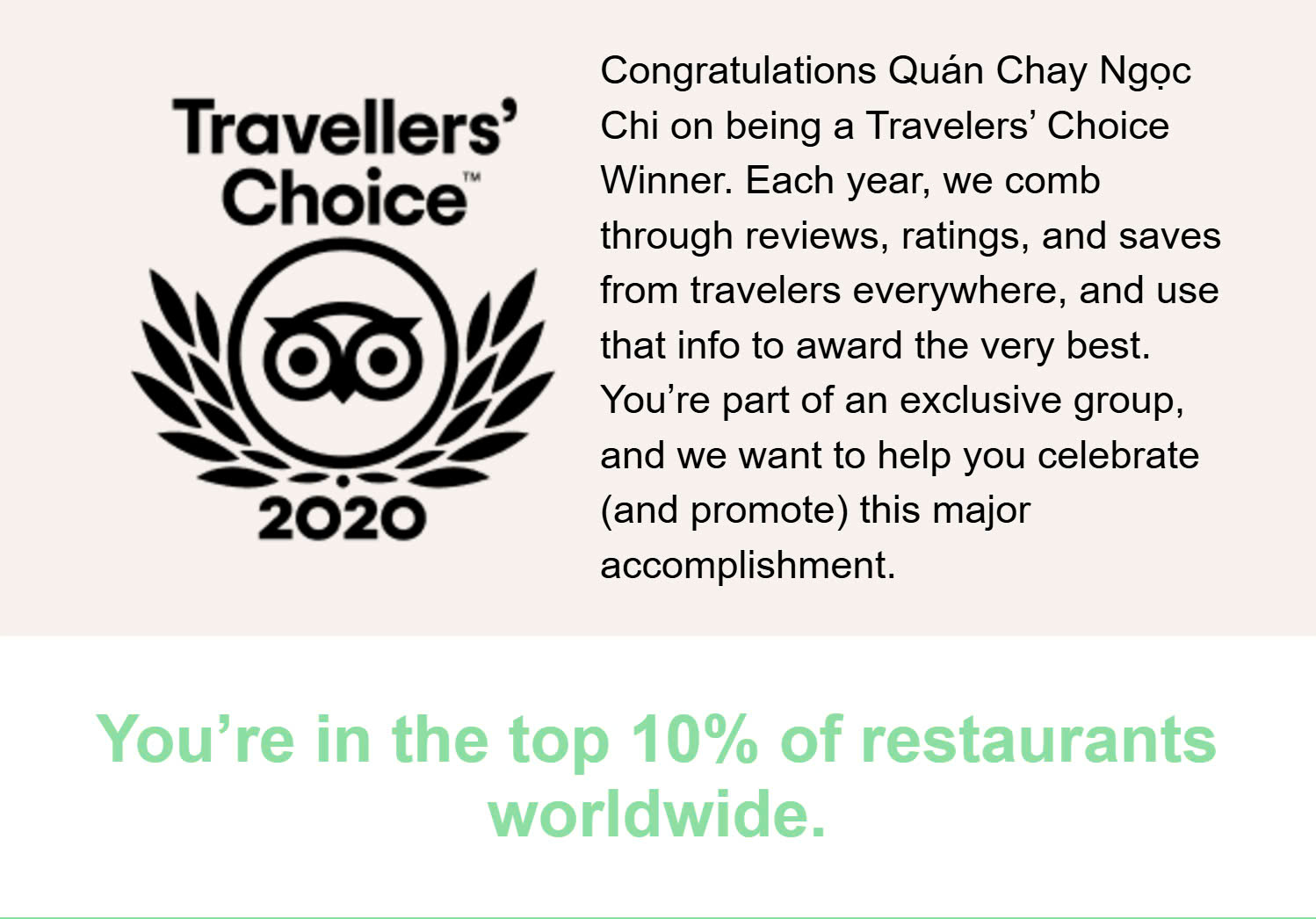 Nhà hàng chay Ngọc Chi vinh dự nằm trong top 10% các hồ sơ niêm yết trên Tripadvisor, giải thưởng này tôn vinh một số nhà nghỉ, điểm du lịch và nhà hàng liên tục thể hiện cam kết về dịch vụ khách sạn/nhà hàng xuất sắc.